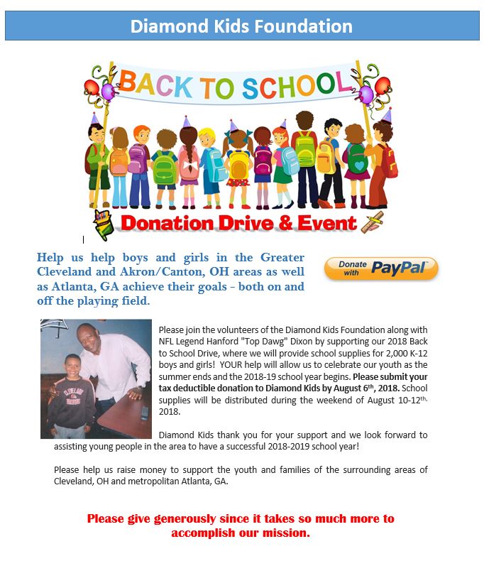 The Diamond Kids Non-Profit Organization strives to assist under privileged youth in the areas of education, health and sports. Our mission is to assist boys and girls across the country achieve their goals - in sports and in the classroom. Our objective is to have youth obtain their high school diplomas and to successfully graduate from college, while maintaining a safe and healthy lifestyle.