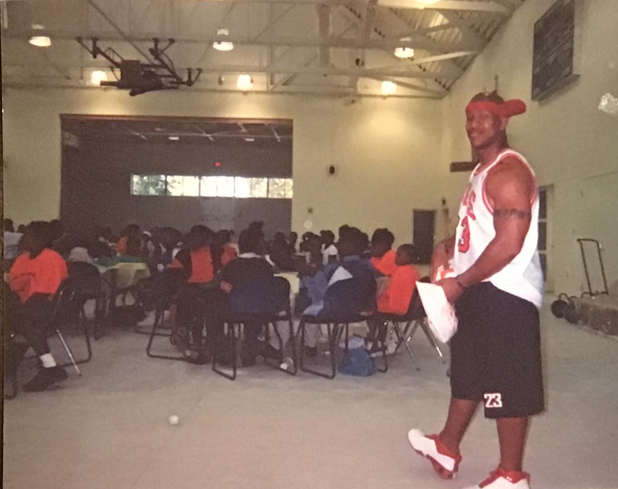 Former NFL Running Back Jamel White addresses kids during a sports clinic at a youth center for under privileged kids.