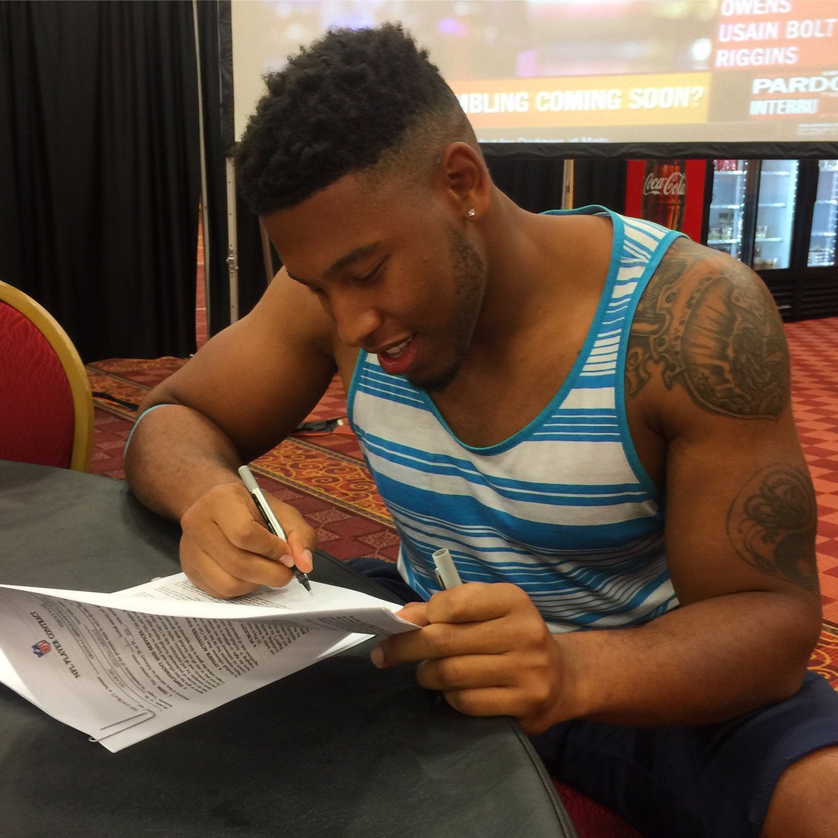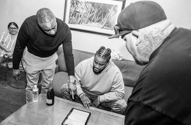 Agent J. LeGrande reviews the terms of Jordan Williams' contract before signing to become a Miami Dolphin.