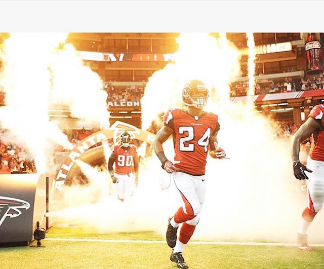 DB Jordan Mabin takes the field in front of a hyped crowd for the Atlanta Falcons.