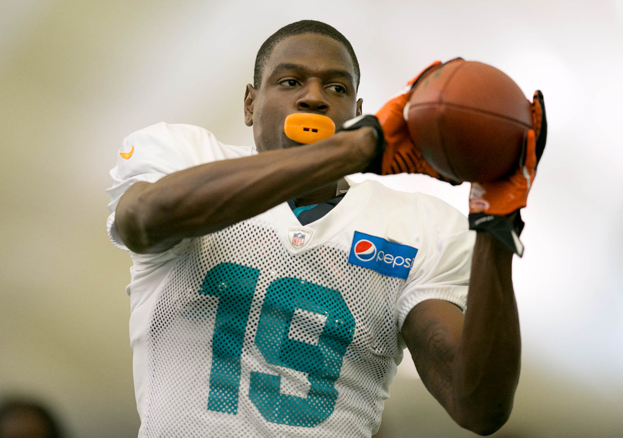 WR Michael Preston shows off his hands before taking the field for the Miami Dolphins.